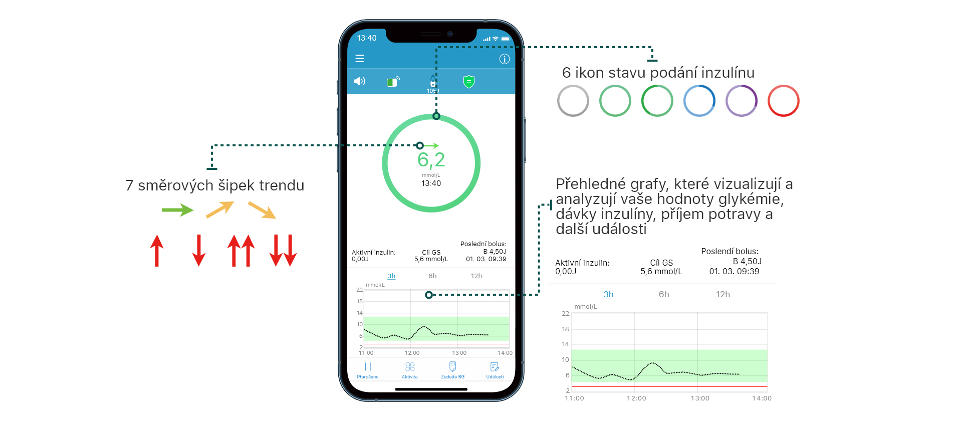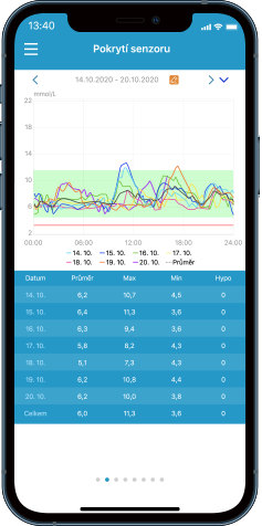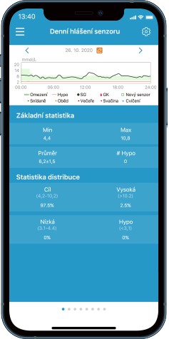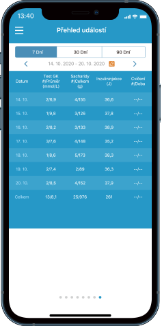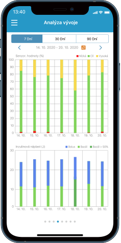 Přehledné grafy, které vizualizují a analyzují vaše hodnoty glykémie, dávky inzulíny, příjem potravy a další události